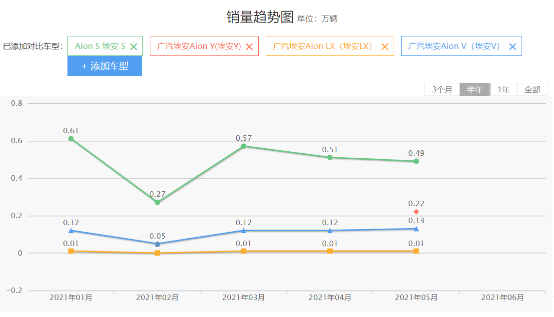 上一个重B端,轻C端的失败案例北汽新能源,至今仍在艰难求生。广汽埃安当然也明白这其中的利害关系。在2020年11月埃安品牌正式独立的时候,广汽埃安总经理古惠南就重申了打造高端智能电动车品牌的目标,广汽埃安副总经理肖勇还激进地设定了一个目标:2021年广汽埃安能够成为高端智能纯电动车品牌中的No.1,销量增长50%。现在2021年已然过半,销量增长目标虽然可以达成,但失去了C端市场,高端化就无从谈起。