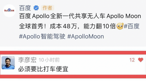 无人自动驾驶出租车商业化迟迟未到,成本一直是一道坎。而百度Apollo就提供了一种解决方案。李彦宏此前还在百度官方视频号下留言:必须要比打车便宜。