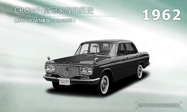 第二代皇冠于1962年推出,采用4灯式前大灯等配置,以当时宽而低的时尚设计为基础,初次采用2档全自动AT变速箱。日本最早安装2.6LV8发动机的车型,CROWN8开始上市(1964年)。