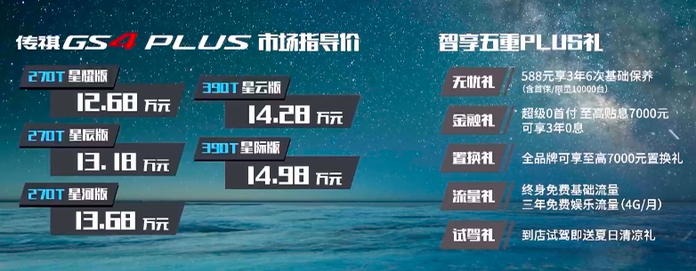 6月30 日, 传祺GS4 PLUS正式上市,新车基于广汽GPMA架构搭载,采用了钜浪动力平台、ADiGO智驾互联生态系统等领先技术,传祺GS4 PLUS的到来,致力于成为“同级最强PLUS”。售价为12.68-14.98万元。
