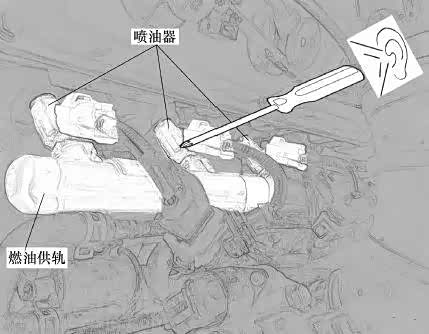 3. 若点火系统正常,可在发动机工作时,用听诊工具抵在喷油器体上(如下图所示),检查喷油器有无“嗒嗒”的工作振动,如未听到工作声音,可本着由简到繁的原则检查喷油器电阻、插接器、线路及ECU,若能听到工作声,不代表喷油器工作完全正常,因为喷油器仍可能存在堵塞、滴漏、雾化不良、喷油量异常等机械故障,从而导致发动机出现失火,怀疑此故障可利用喷油器清洗机对喷油器进行清洗,检查,如清洗后效果仍不明显,应更换喷油器。另外,在拆检喷油器前采用喷油器免拆清洗法,也是一种不错的尝试。