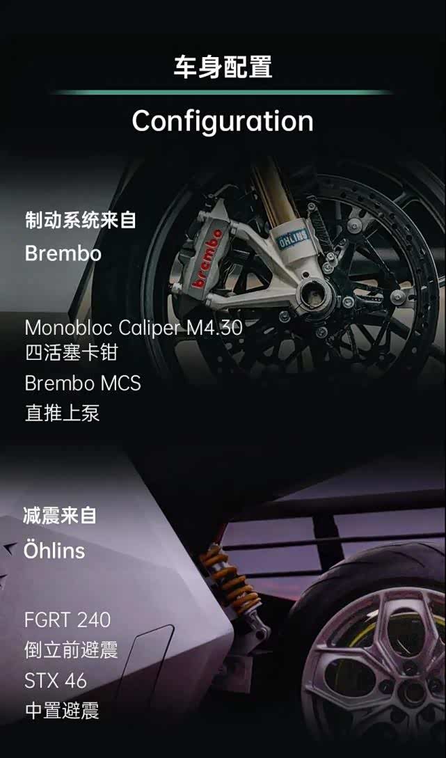 硬件方面就没有限量版那么豪气了,同样是来自Brembo的刹车卡钳,只不过换成了M4.30,直推上泵也换成了Brembo的,由Ohlins提供前后避震。座高795-815mm,整备重量255kg,配备无钥匙启动和多种骑行模式。