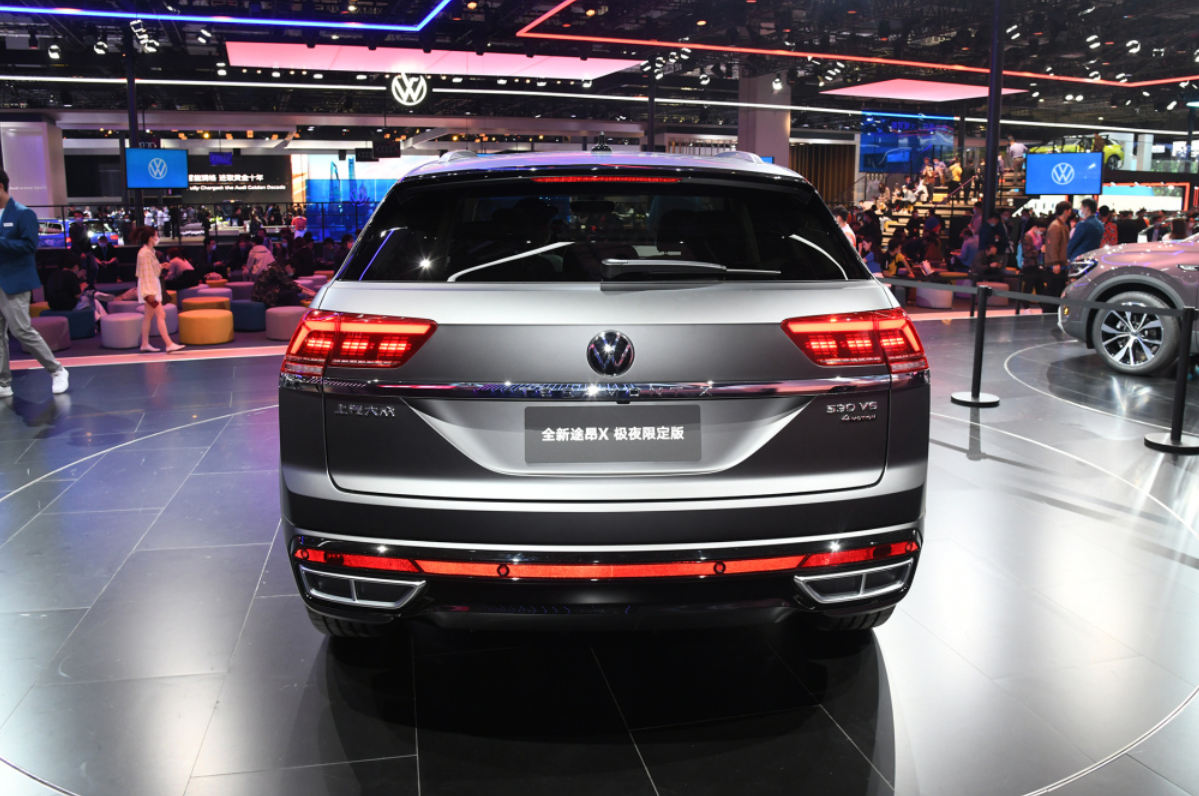 车尾部分,途昂X设计感较强,车顶上方的尾翼让尾部看起来更加动感。两侧大灯的造型也非常独特,下方由一条银色饰条贯穿起来,有效拉伸视觉宽度。下包围部分,同样采用贯穿式红色反射片,排气布局采用双边共两出的装饰设计,真正的排气隐藏在车尾下方。