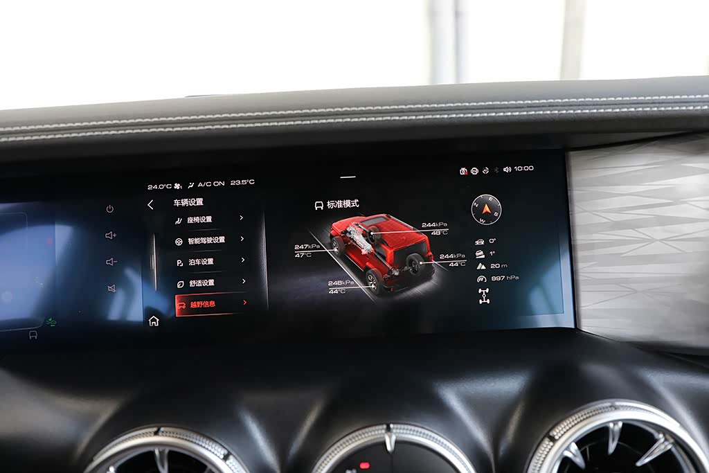 不过最值得炫耀的是,液晶屏幕以及中控屏幕都可以显示车辆的方向、角度、坡度、清晰度等信息,这对于越野爱好者来说是个好事。