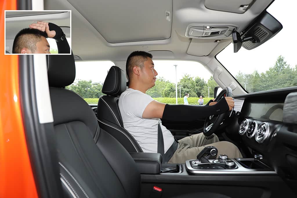 空间方面也足够你使用,体验者身高180cm,来到驾驶席,将座位调至最低。头部空间四指的距离,整体的表现还算不错。