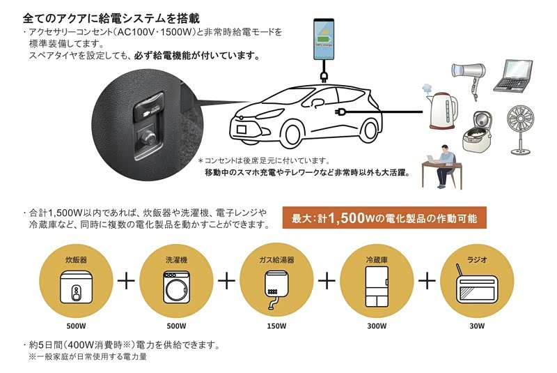 更贴心的是,大改款普锐斯在前座中央扶手后方还设置了可供电器使用的AC100V电源插座,这项设计是为了在遭遇停电等紧急状况时,能够通过应急供电模式提供应急用的备用电源,简单来说就是大改款普锐斯即使在停车状态下,也能供电给电热水壶、洗衣机、烘干机等电器使用,合计最大电力可以达到1500W。当然,正常行驶下也能通过车内的USB插孔为手机等电子设备充电。