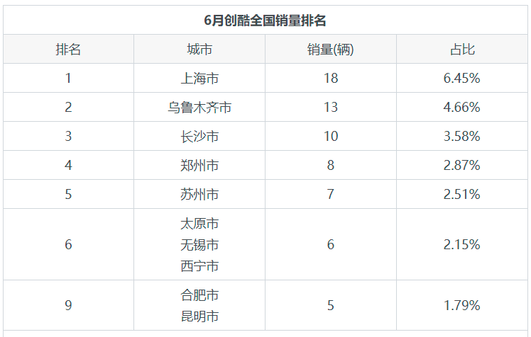 在2021年6月创酷全国销量分布情况中,上海市以18辆的销量位列第1名,占全国销量6.45%;乌鲁木齐市以13辆的销量位列第2名,占全国销量4.66%;长沙市以10辆的销量位列第3名,占全国销量3.58%。