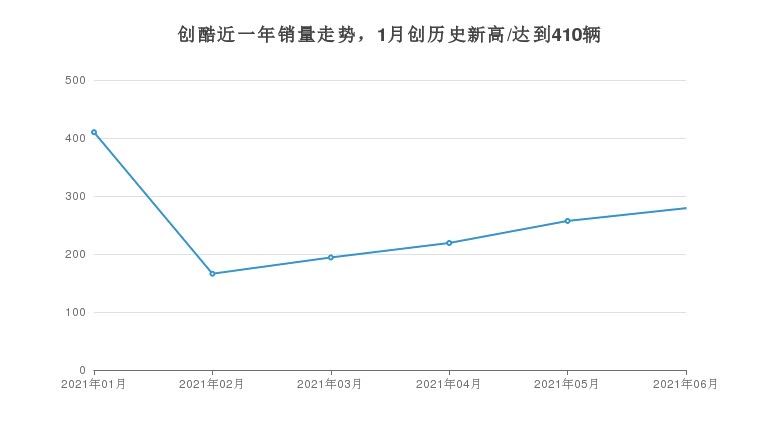 2021年6月,创酷销量为279辆,同比下降75.07%,环比增长8.56%。1-6月份,创酷销量为1525辆,同比下降70.06%。在最近1年中,创酷销量在2021年01月达到最高,销量为410辆。
