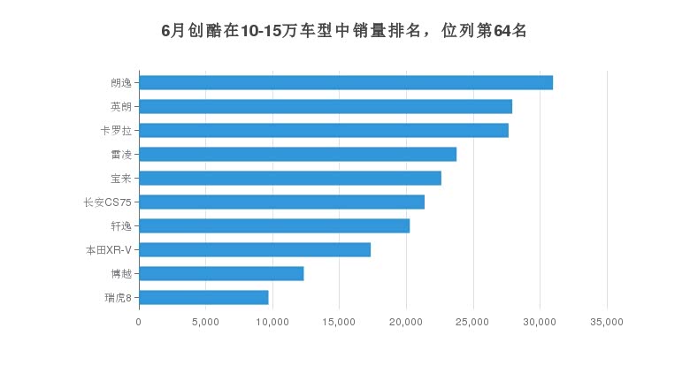 在2021年6月的同价位车型销量排名中,创酷销量位列第64名,与第1名朗逸的销量差距为30701辆。