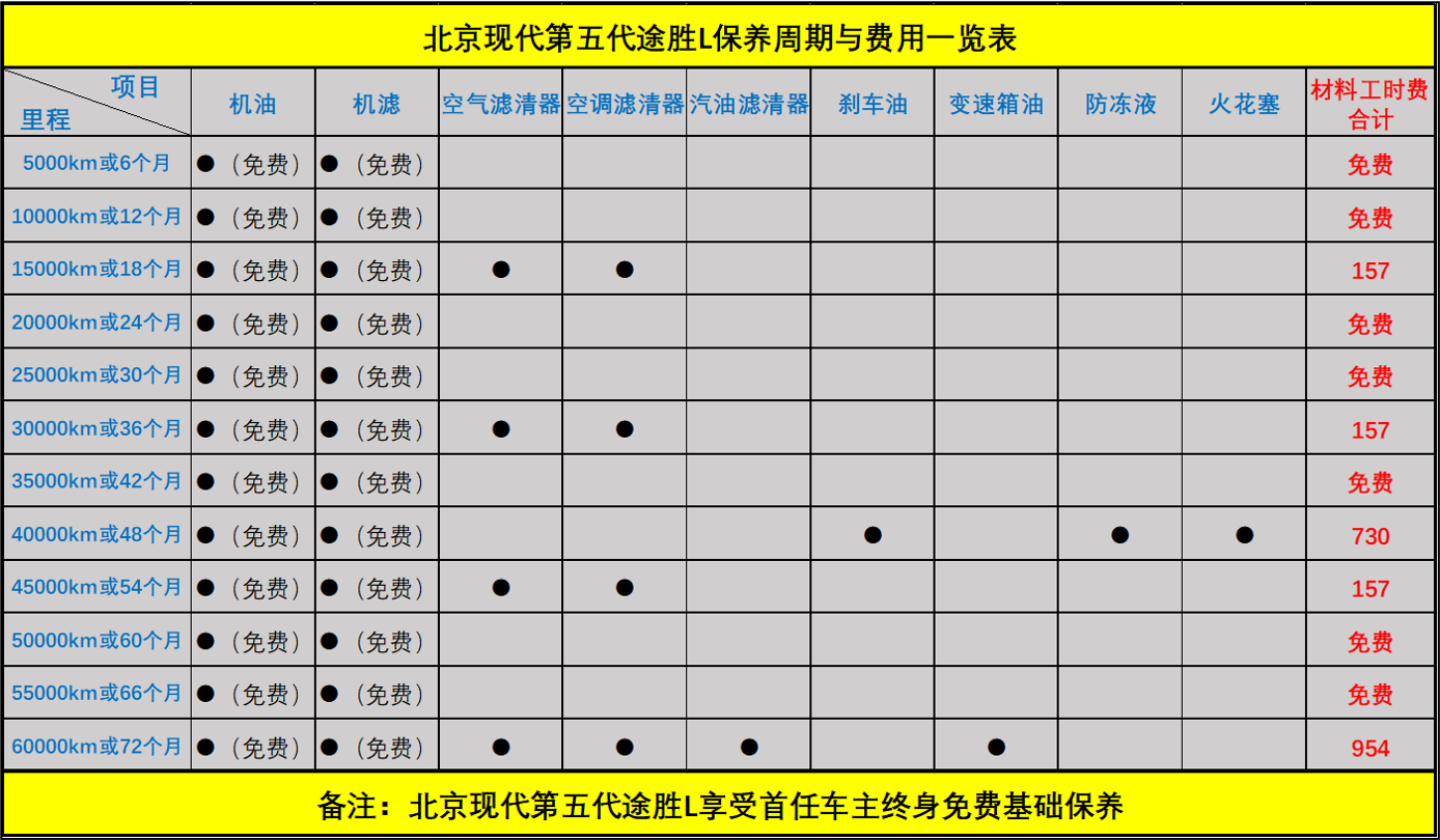 目前了解到,第五代途胜L可享受“首任车主终身免费基础保养”政策,免费的保养包括免费更换机油、机滤,以及相关的人工费免费。但另外的一些保养项目是要收费的,如空气滤清器、空调滤清器、汽油滤清器、刹车油、变速箱油、防冻液、火花塞等,这些就不属于免费基础保养范围,要做这些保养则要收取相关的物料费和人工费,上表是我了解到的保养项目费用。