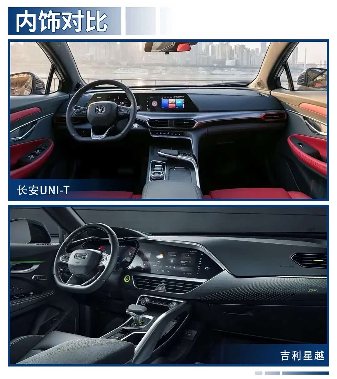 从动力的参数数据来看,两款车动力没有多大的区别,并且两款车都是搭载了七速双离合变速箱。不过,在实际的体验当中,UNI-T整体的动力输出性格比较偏向于运动风格,而星越则是显得比较的温和,在驾驶感受来说,UNI-T运动风格化的性格会更加适合年轻的消费者,而星越的驾驶风格则是会显得更加适合有家庭的人士。