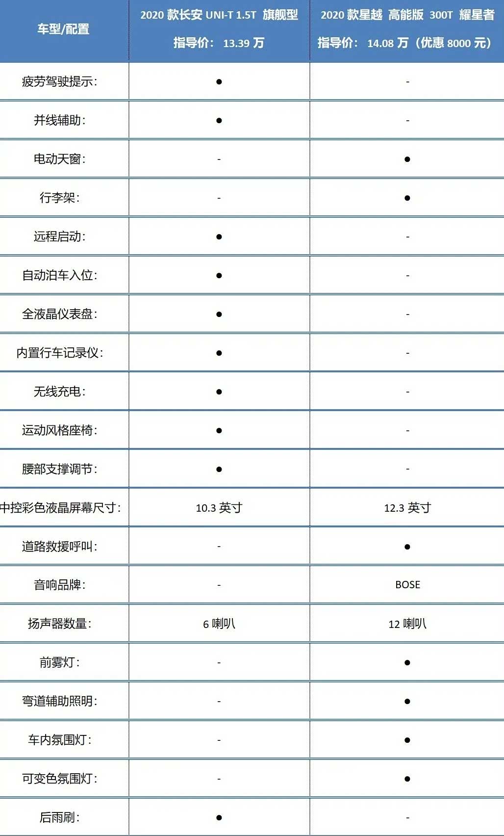 因此,总的来说,在除了相同的配置的基础上,UNI-T的配置会更加注重安全性多一些,而星越要要稍微更注重用车的舒适性一些。两款车的配置的差异性比较明显。当然,其价值的差距也不是非常大,因为基础配置已经足够丰富。所以,在选择上要根据个人的需求来进行选择,比如说驾驶技术一般,选择UNI-T会更适合,而如果对自己的驾驶技术有自信,选择星越更适合。