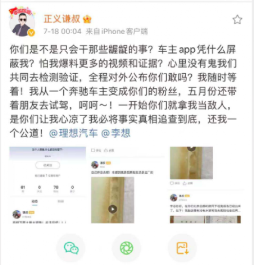 并且在随后该车主还表示其在官方车主APP的账号被屏蔽,直言理想只会干这些龌龊事,并怀疑官方此举是心里有鬼,怕被爆出更多猛料。