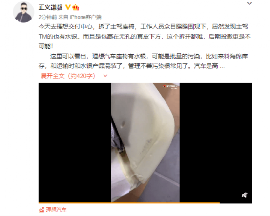 就像娱乐圈网友评论的一样,林生斌感谢于晓光,于晓光感谢华晨宇,华晨宇感谢都美竹一样,蔚来应该感谢一波理想了。正当“蔚你折腰”事件愈演愈烈的时候,忽然理想登场了,成功一波引流。此前闹地沸沸扬扬的理想“水银门”当事人车主发微博称,他去理想交付中心发现,拆了主驾座驾后,发现主驾也有水银。