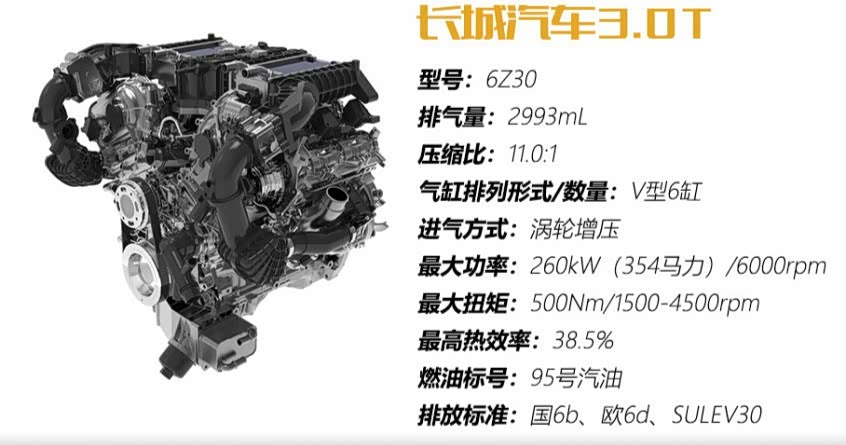 长城汽车打造了全新3.0T汽油发动机,其代号为6Z30。这款3.0T发动机采用V型6缸布局和米勒循环,并配备了两颗涡轮增压器。两排气缸采用60度夹角设计,主要为了控制发动机宽度,车型适配性更强。3.0T发动机采用铝制缸体,不仅重量更轻,还可提升散热性能。缸盖集成了排气歧管,热管理效能具备一定优势,暖机速度更快,冷启动噪音相对更小。为了降低增压空气的压力损失,这台发动机采用更加紧凑的进气管路设计,缩短了进气过程造成的动力迟滞。