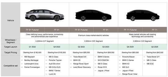 而根据FF的招股书,在2025年前有共计生产3款车型的计划,除了上述的FF 91,还有对标Model S、Model X的FF 81,和对标Model 3、Model Y的FF 71,两者的初创版起步价约合人民币61.4万元和42.03万元,不过FF在终端车型的竞争并没优势,就拿中型SUV来看,国产化越来越高的特斯拉,可以把Model Y补贴后起步价降到30万内,这点不仅还在“纸上谈兵”的FF,相信目前“蔚小理”的体量,也难以达到如此水平。
