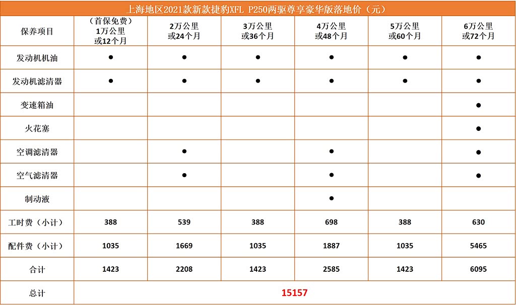 新款捷豹XFL上海地区提供免费首保,提车5000-7000公里或半年进行首保,之后每1万公里或12个月进行一次保养。从表格中看到,新款XFL基本保养机油和机滤再加上工时费,总共价格为1423元,符合多数豪华品牌保养价格水平;而大保养在60000公里或72个月时候进行保养,整体包含工时费价格为6095元;无论整体保养里程间隔还是保养价格、项目等都挺合理。