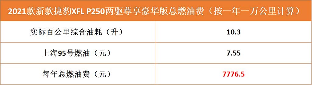 新款捷豹XFL全系搭载一台Ingenium 2.0T发动机,技术底蕴颇高喝的是95号汽油。从市场实际反馈的百公里综合油耗10.3升作为参考,当前上海地区95号燃油每升为7.55元,按照每年一万公里行驶里程来看的话,总燃油费用为7776.5元。