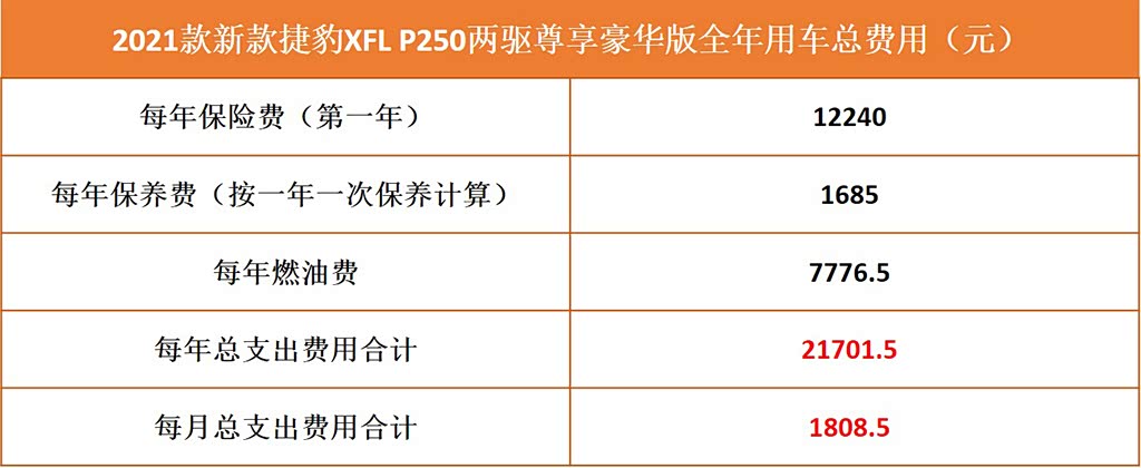 我们最后来看下新款捷豹XFL一年用车成本总共多少?第一年保险费用共为12240元;而保养费用我们按照一年保养一次来计算的话,平均为1685元;总燃油费共为7776.5元;那么一年所产生的必要花费共为21701.5元左右。一年用车总成本平摊到每月,月均成本为1808.5元左右,整体每月花费还行,并没有很大压力。
