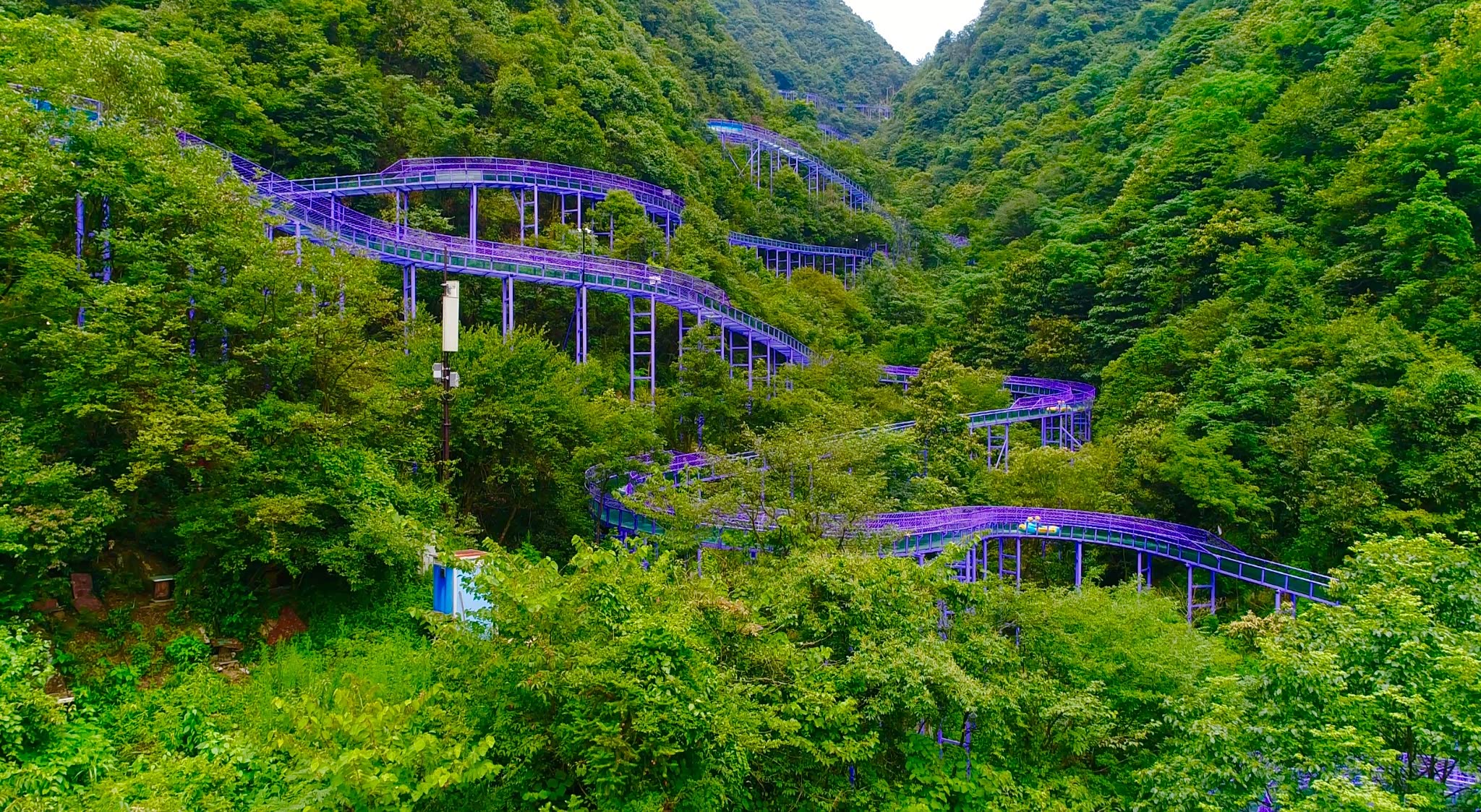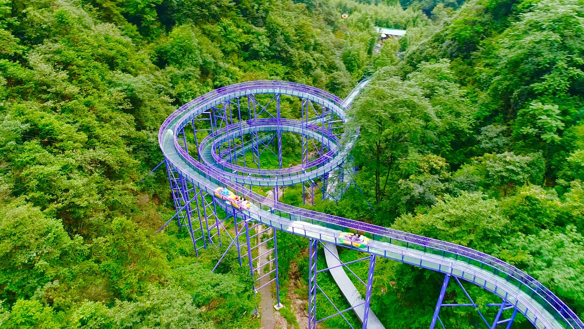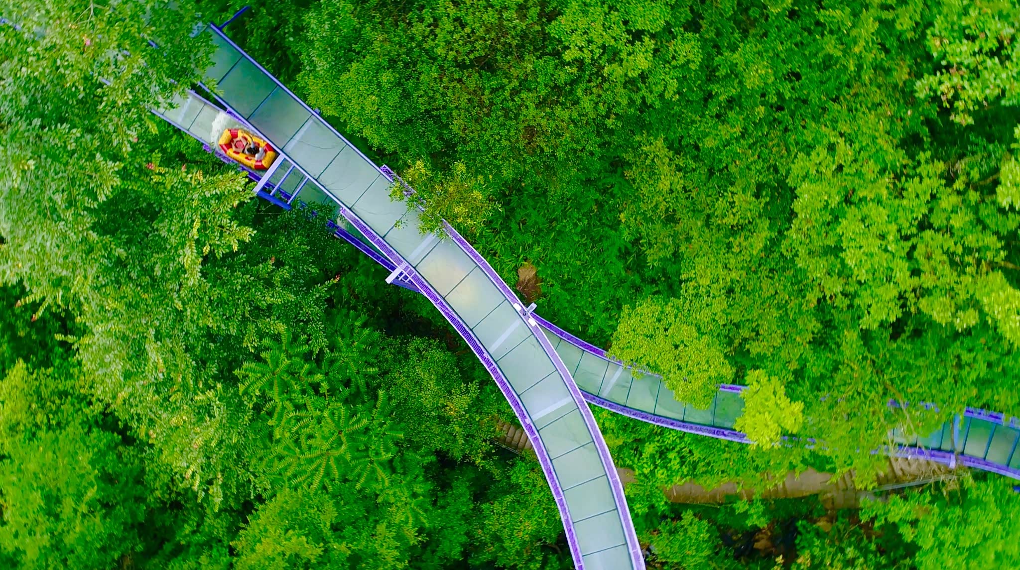远远望去,玻璃滑道一路蜿蜒直达远方,宛如紫色的飘带缠绕于山间。