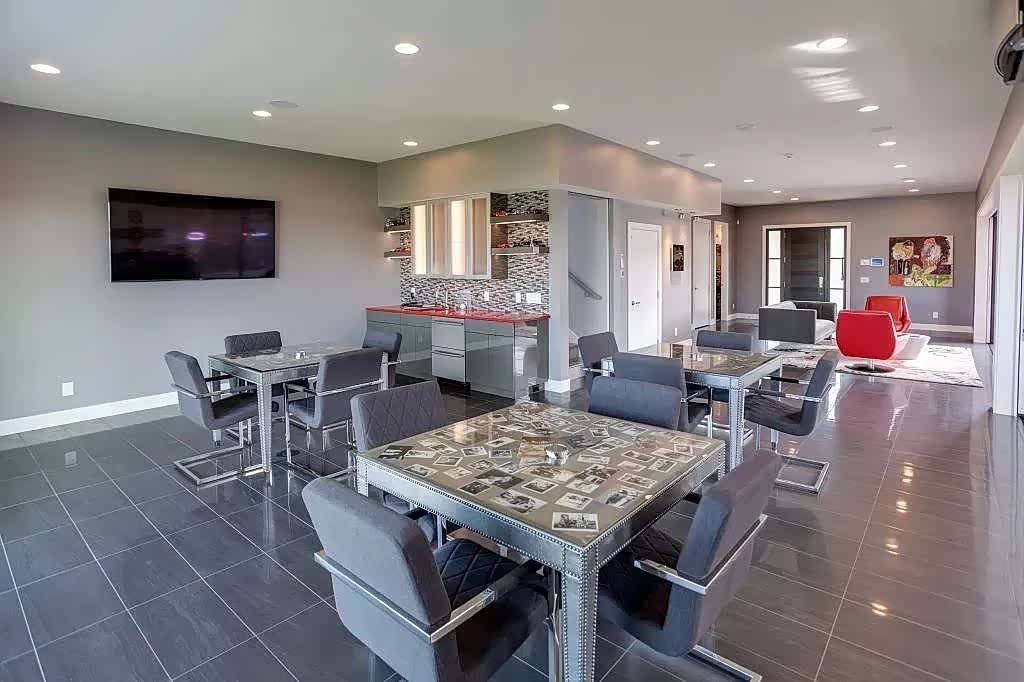 值得一提的是车库墙壁装饰了价值几千美元的汽车相关艺术品,而厕所内的轮胎方向盘都是经典车上的原厂配件。