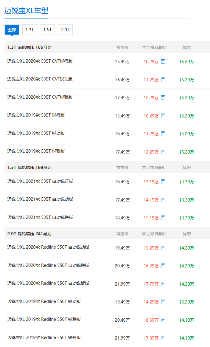 近日,广州地区的某汽车经销商公布了迈锐宝XL在当地的优惠情况,具体车型售价行情如下图所示: