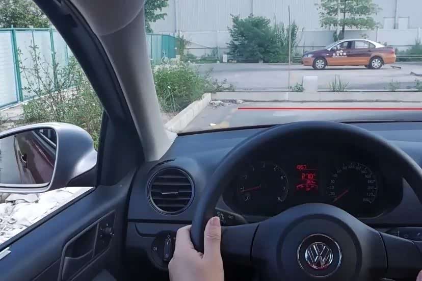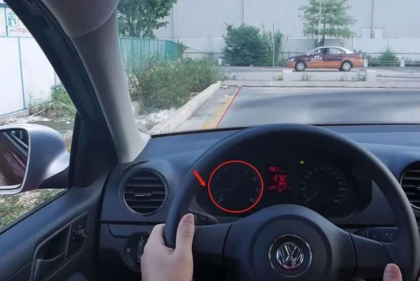 咱们今天讲右直角转弯:进入直角转弯项目感应区之前,提前调整好方向靠左行驶,先打右边转向灯,然后观察左边发动机转速表左边缘位置挨到黄线右边缘位置,一直往前慢速行驶。
