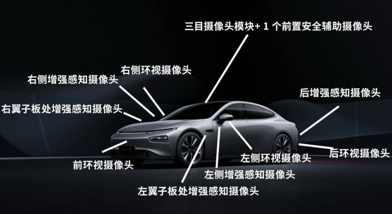 XPILOT2.5硬件上会有一个单目摄像头和三个毫米波雷达。同时泊车摄像头变为 4 个,并且有 12 个超声波雷达;而XPILOT 3.0 的硬件水平会上一层楼,高精毫米波雷达为 5 个。车外共计 13 个摄像头,其中包括前置 4 个摄像头(1 个三目摄像头模块和 1 个前置安全辅助摄像头)、5 个增强感知摄像头(左右两侧各 2 个,后置 1 个)、以及 4 个环视摄像头;同时车内也有一个摄像头,全车共计 14 个摄像头。因此XPILOT3.0配合整车OTA升级,未来会有更大的潜力。