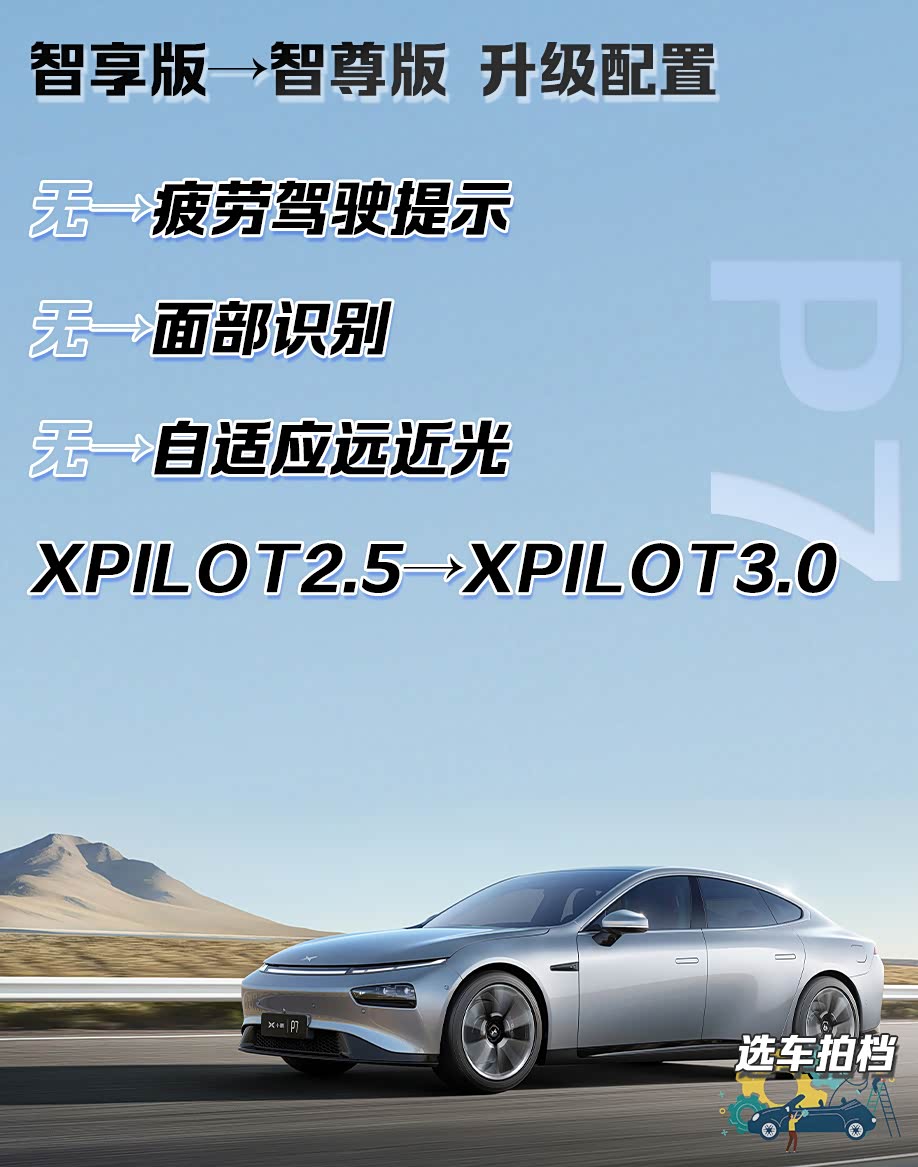 在续航水平一致的前提下,智享版与智尊版的配置差别在全部的续航版本车型中完全一致,差价也完全一致,均为1万元,因此可得知由XPILOT2.5的硬件水平升级至XPILOT3.0外加自适应远近光的功能要多花1万元。