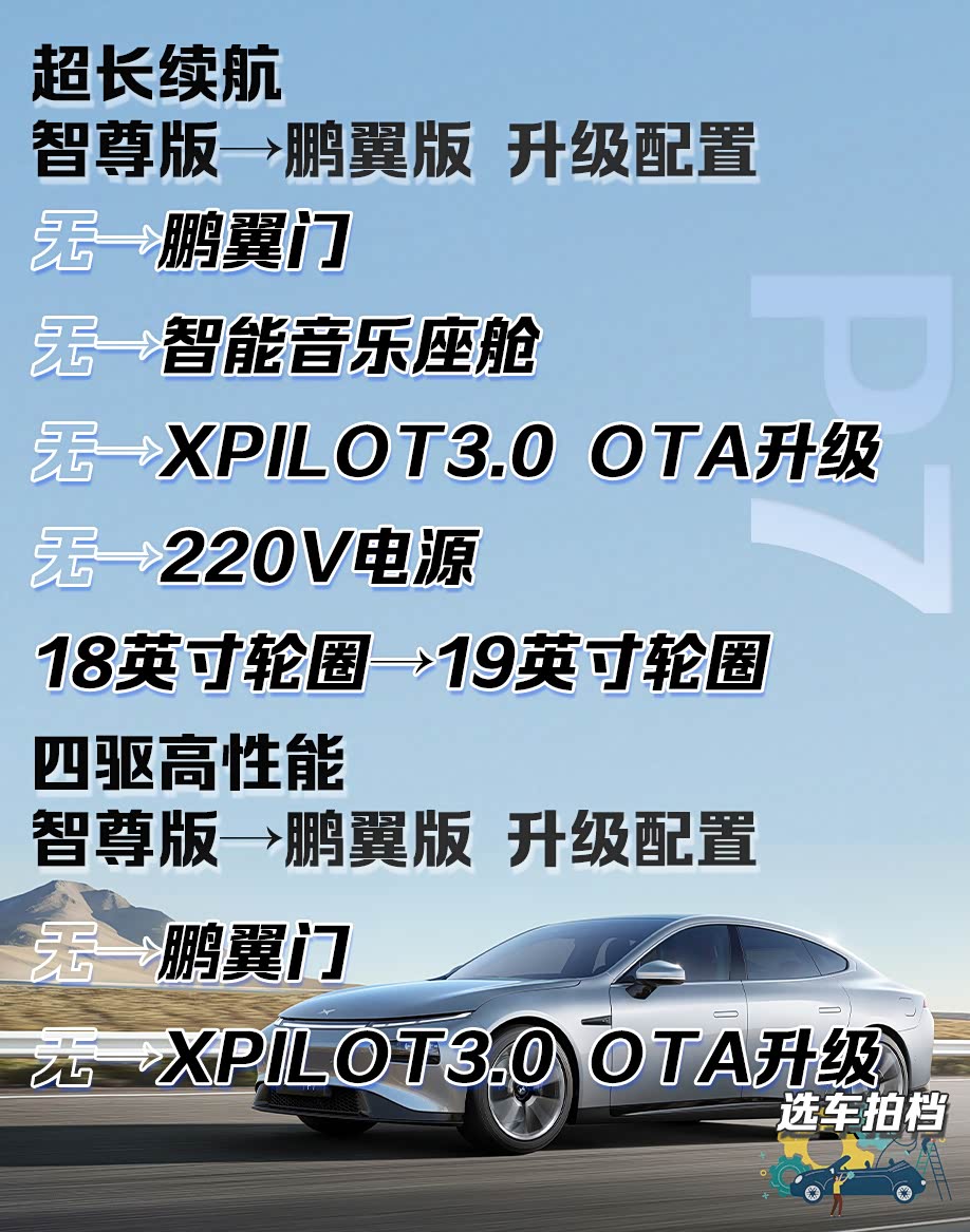 鹏翼版作为P7的最顶配车型,与相同续航版本的智尊版差价分别是:超长续航9万元、高性能四驱6万元,这3万元相差的配置有价值1.8万元的智能音乐座舱选装包以及19英寸的轮圈和一个220V的电源,因此如果喜欢超闪绿的外观和拉风的鹏翼门外观,并且预算不紧张,单单就配置而言,四驱高性能版要更加具有性价比。不论是哪一款鹏翼版,其中多出的高额差价都包含了XPILOT3.0的软件及升级服务,上文并没有详细提到这个选装包,其智尊版标配的XPILOT3.0指的是硬件和基础的驾驶辅助系统,而对于智尊版而言,包含NGP自动导航辅助驾驶、SR自动驾驶环境模拟显示、停车场记忆泊车、IHB智能远光灯这四项的软件及升级服务需要后续购买,其终身服务费为3.6万元,而鹏翼版则自动包含此选装包,不需要另行付费。