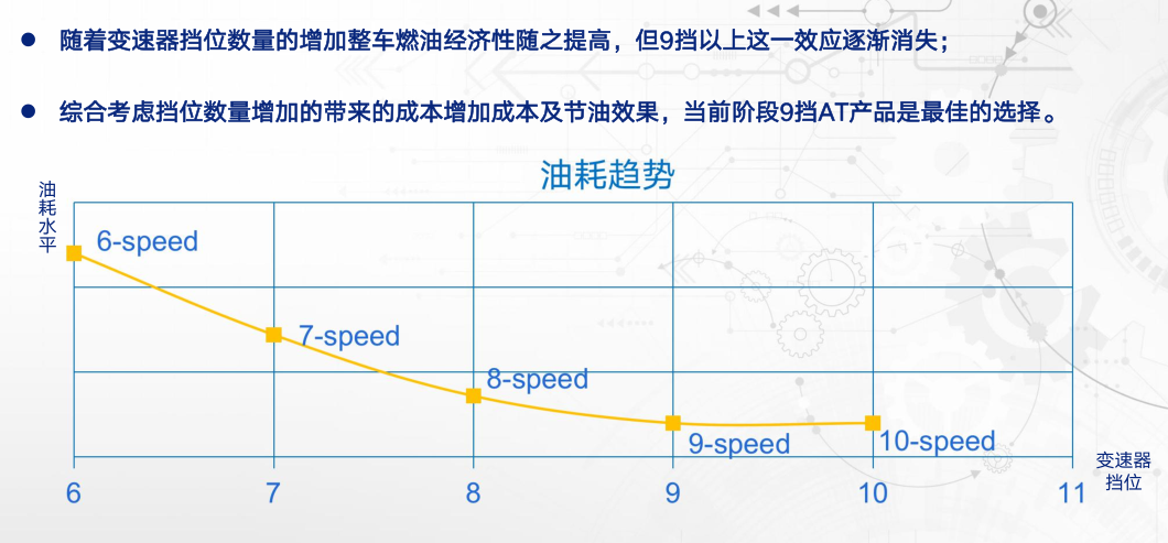 而选择9个挡位,则是为了动力性和经济性的综合考虑。在动力性方面,这台9AT选择了更大的一档速比,满足了更好的加速性能;而在燃油经济性方面,根据挡位和油耗趋势这一规律来看,目前9挡算是最优的选择。