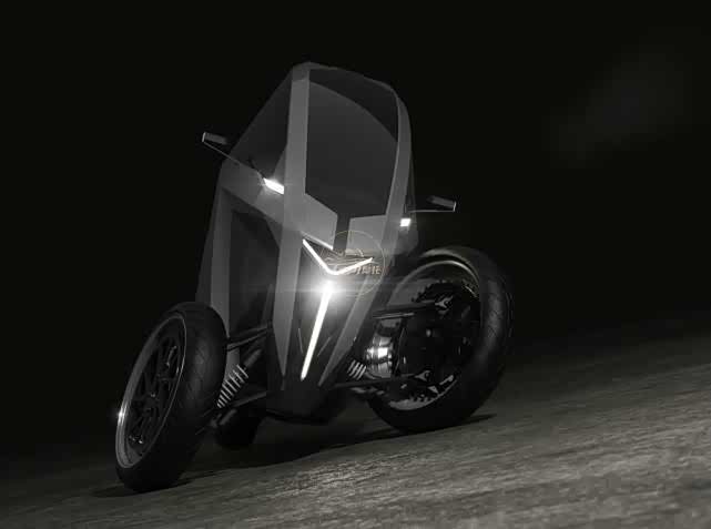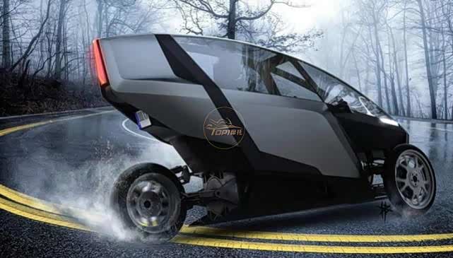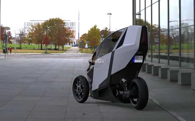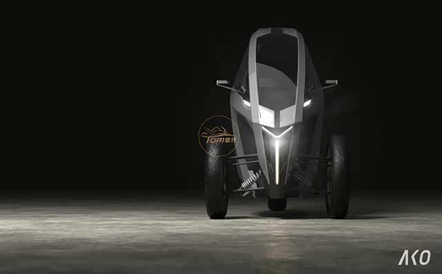 AKO倒三轮轮电动摩托车,最高时速240km/h,续航300公里,通过方向盘操作,可以像摩托车一样倾斜,由电动机提供动力,为了乘客的安全,配备了安全气囊和4点式安全带。