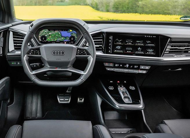 内饰方面,奥迪Q4 e-tron沿用了燃油版车型的设计,并将座舱进行了四个数字区划,包含奥迪虚拟驾驶舱、自然语言语音控制、中央MMI触摸显示屏和全新的增强现实平视显示器。其中全液晶仪表盘与四辐式可触摸操作方向盘相结合,中控屏采用嵌入式设计,车机系统搭载MMI多媒体触控系统。此外,新车还采用了与e-tron GT相同的按钮式换挡机构,车辆启动按键和换挡机构均安装在中控台下方的手台上。
