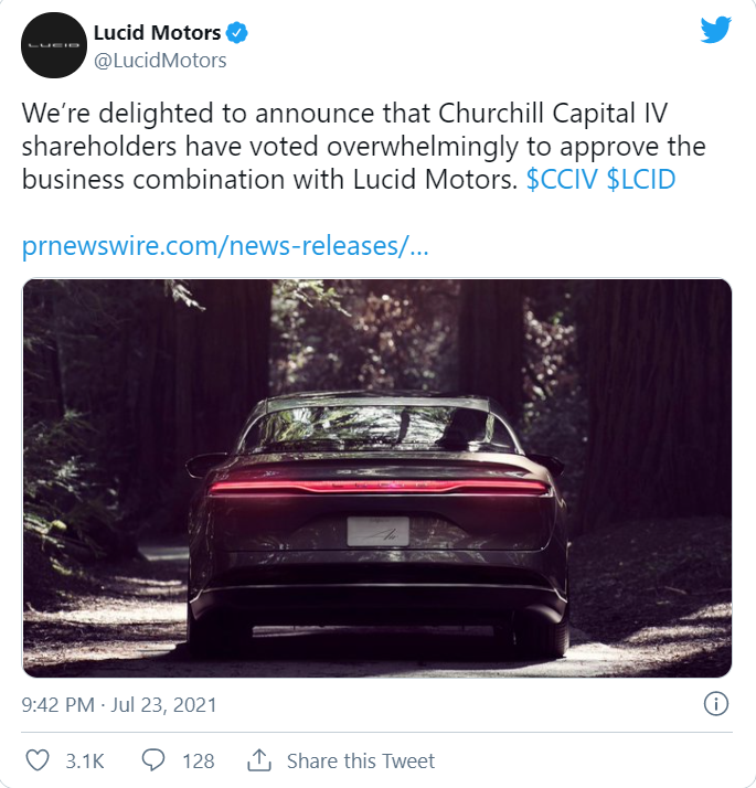 Lucid Motors首席执行官兼首席技术官彼得·罗林森分享了他对合并的看法: “我们很高兴能完成与 CCIV 的业务组合,成为一家上市公司。Lucid 进一步增强了其势头,因为我们准备在今年晚些时候交付我们的 Lucid Air 电动轿车系列。我们正在对公司的长期增长和创新进行重大投资,我们将继续使用世界一流的技术,以积极影响人类向可持续发展的过渡。“