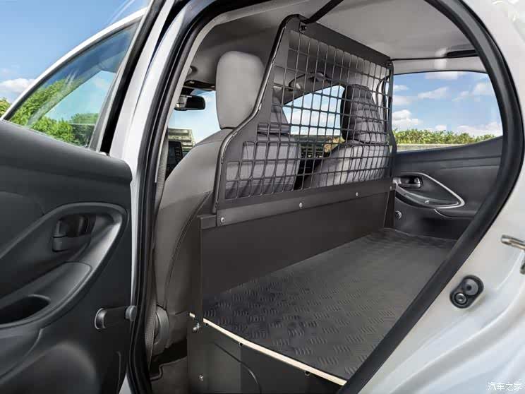 YARiS Van的轮圈样式非常普通,尺寸也比较小,这样一来轮胎的胎壁更厚,方便承载货物的重量,也不容易发生爆胎等意外。新车最大的亮点从车尾就能看到,尾门打开,巨大的后备箱甚至让人怀疑这是一台尺寸不小的SUV。不过仔细来看就能发现这台车的后排座椅已经不见了,取而代之的是一套厢式货车系统,地板铺满了金属防刮板,在座椅和“货仓”之间还有隔离用的网栅。据悉,这台车的后排载货容积达到了720L,可承载430kg的货物。