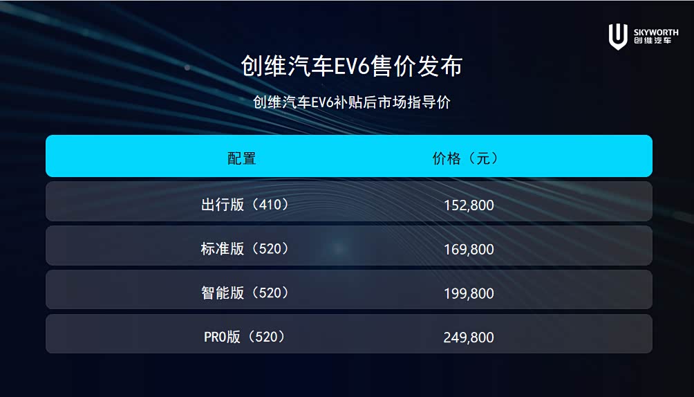 今日(7月27日), 创维汽车EV6正式上市发布。该车曾用名创维ET5,而创维汽车ET5又是由天美ET5更名而来。两次更名后,创维EV6相比较ET5在外观内饰方面并没有明显变化,但在配置、动力电池等方面进行了改变升级。创维EV6共推出4款车型,售价为15.28-24.98万元。另外,官方还推出了续航里程600公里的车型预售,该车型计划明年第一季度上市,99元订金可抵扣10000元;创维EV6-HTi(智混版)计划明年第二季度上市,99元订金可抵扣5000元。