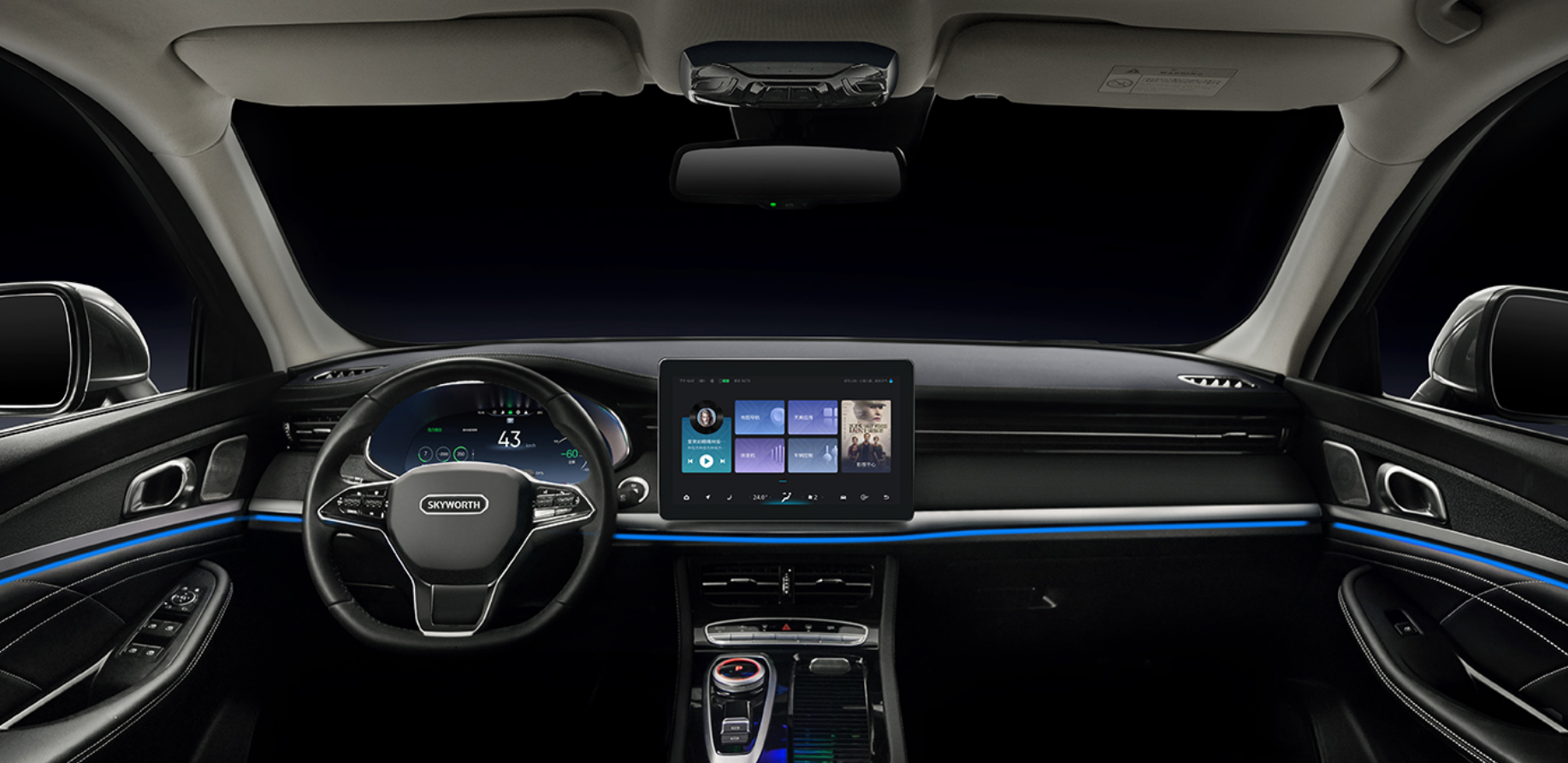 来到车内,新车的内饰布局和此前的创维ET5基本相同,中控台层次感分明,12.8英寸的悬浮式中控屏十分吸引眼球。做工用料方面使用了多种材料拼接组合让内饰看上去更加具有高级感。三辐式多功能方向盘中间同样是“SKYWORTH”的品牌英文,此外新车配备了12.3英寸全液晶仪表、旋钮挡杆等。