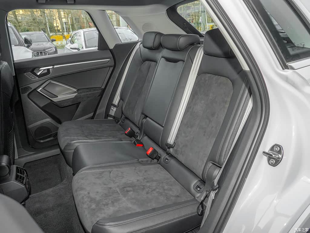 奥迪Q3配备了运动风格的座椅,座椅的面料选用了真皮与Alcantara混合搭配。另外,运动座椅独有腿部支撑调节和四向电动腰托调节,即使长途自驾也可以让身体处于轻松舒适的状态。后排座椅要柔软不少,不过整体的坐感依旧偏硬。同时后排座椅前后有着150mm的可调空间,靠背支持无级调节,提供了较高的舒适度。