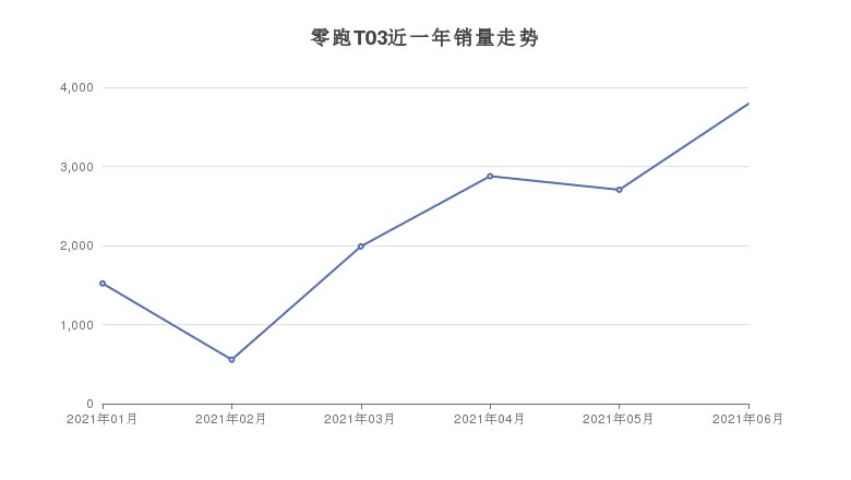 零跑T03在2021年6月份的销量为3791辆,同比增长967.89%,环比增长40.2%,在5-10万两厢车中销量位列第10。相比于5月,零跑T03的销量增加了1087辆。