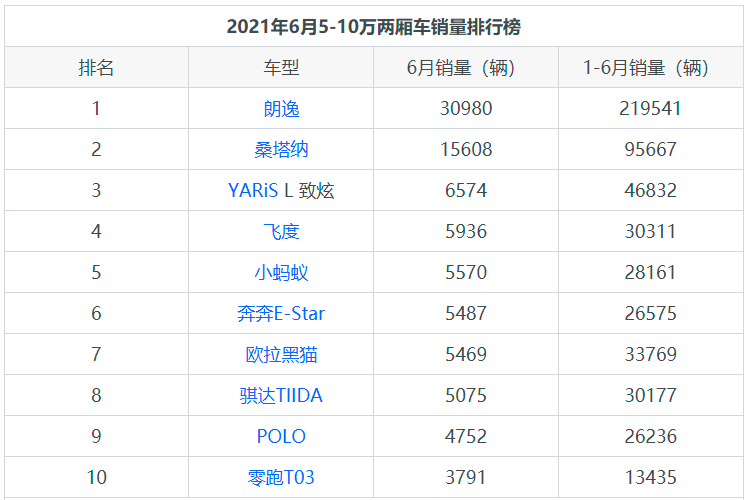 在5-10万两厢车销量排行榜中,6月份朗逸、桑塔纳、YARiS L 致炫都获得了非常不错的销量表现,销量靠前代表了多数消费者的认可,如果您近期有购买一款5-10万两厢车的计划,可以把这份榜单作为购买参考。