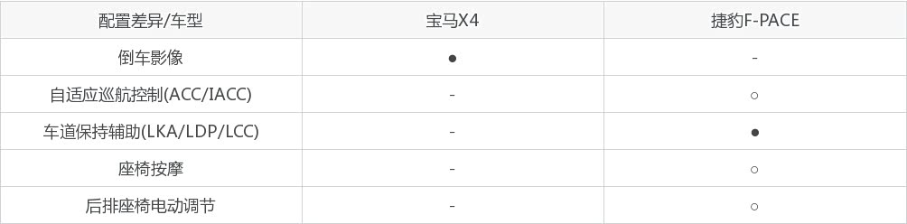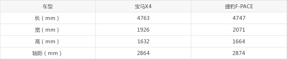 通过以上对比我们可以看到,在车身长度上,宝马X4占优势;在车身高度上,捷豹F-PACE占优势。