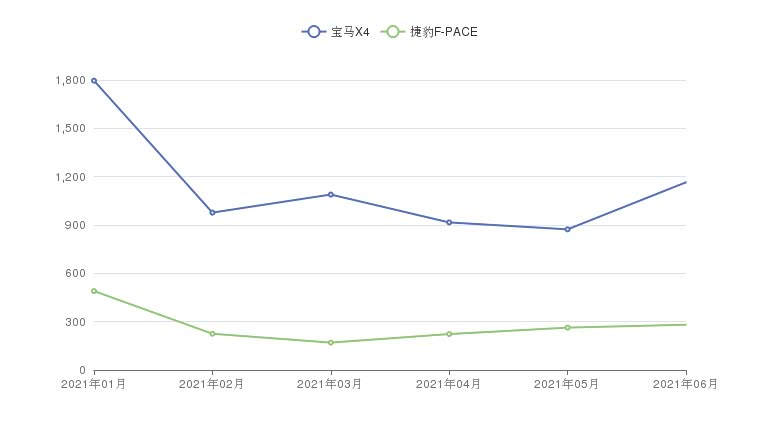 销量往往是购车的重要参考,根据众车网汽车行业数据监测显示,从2021年06月终端的销量来看,宝马X4的销量为1165辆,捷豹F-PACE的销量为281辆,宝马X4要比捷豹F-PACE多售出884辆。