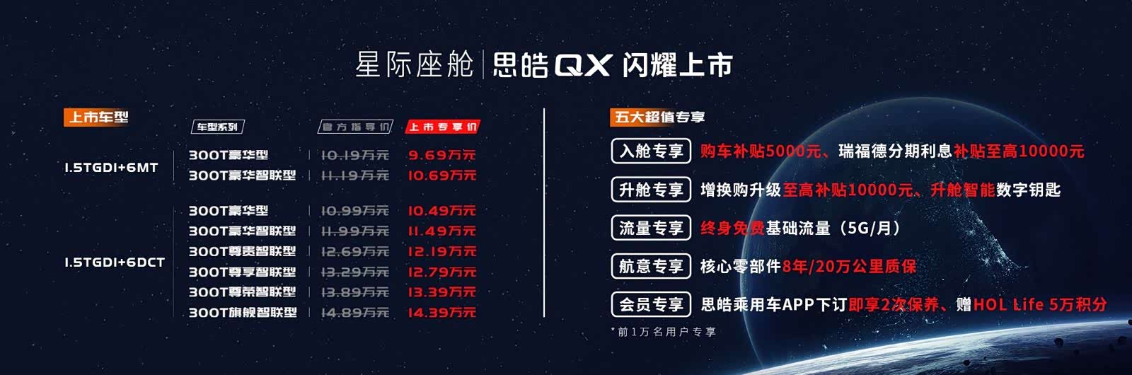 总结:作为MIS皓学架构下的首款产品,思皓QX有着更为强劲的表现。前卫时尚的外形,突出科技感的内饰,打造了不错的第一印象。动力系统的全面升级,也给用户带来足够信心。经过一番比较,我们这里更推荐12.69万元的尊贵智联型和13.89万元尊荣智联型两款车型。随着新车上市,厂家也推出了多项优惠政策,如购车前1万名用户可享入舱专享、升舱专享、流量专享、航意专享和会员专享五大优惠政策。包括5000元购车补贴、利息补贴至高10000元、增换购升级至高补贴10000元、升舱智能数字钥匙、终身免费基础流量5G/月、核心零部件8年/20万公里质保、思皓APP下订即享2次保养和赠HOL Life 5万积分。感兴趣的朋友不妨到店亲自体验。(文/图 车言堂)