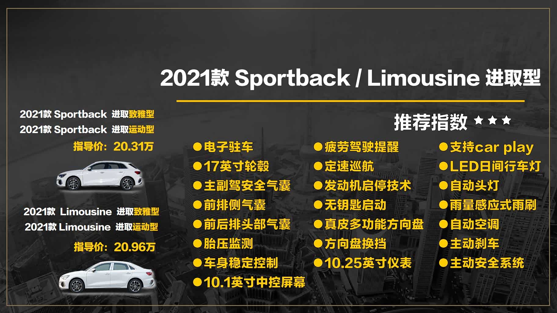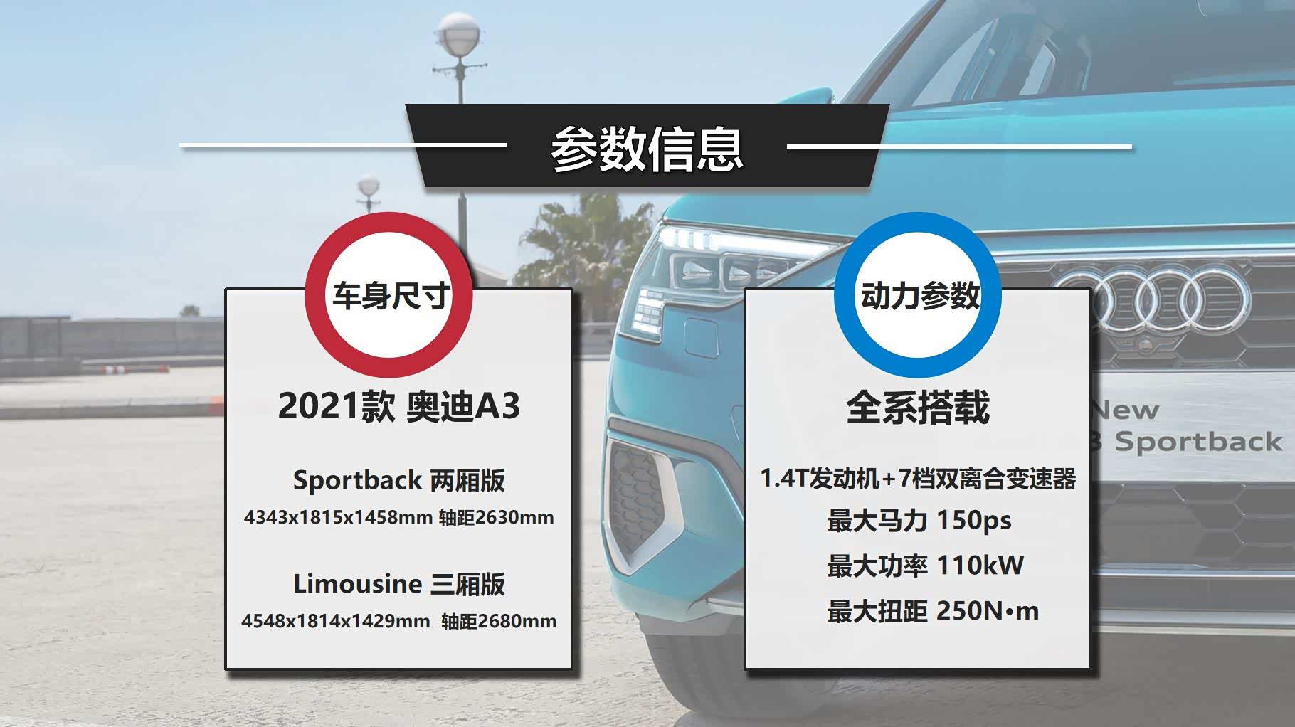2021款奥迪A3全系共推出14款车型,两厢版与三厢版各7款,均搭载1.4T发动机+七速双离合变速器,指导价20.31-24.97万。