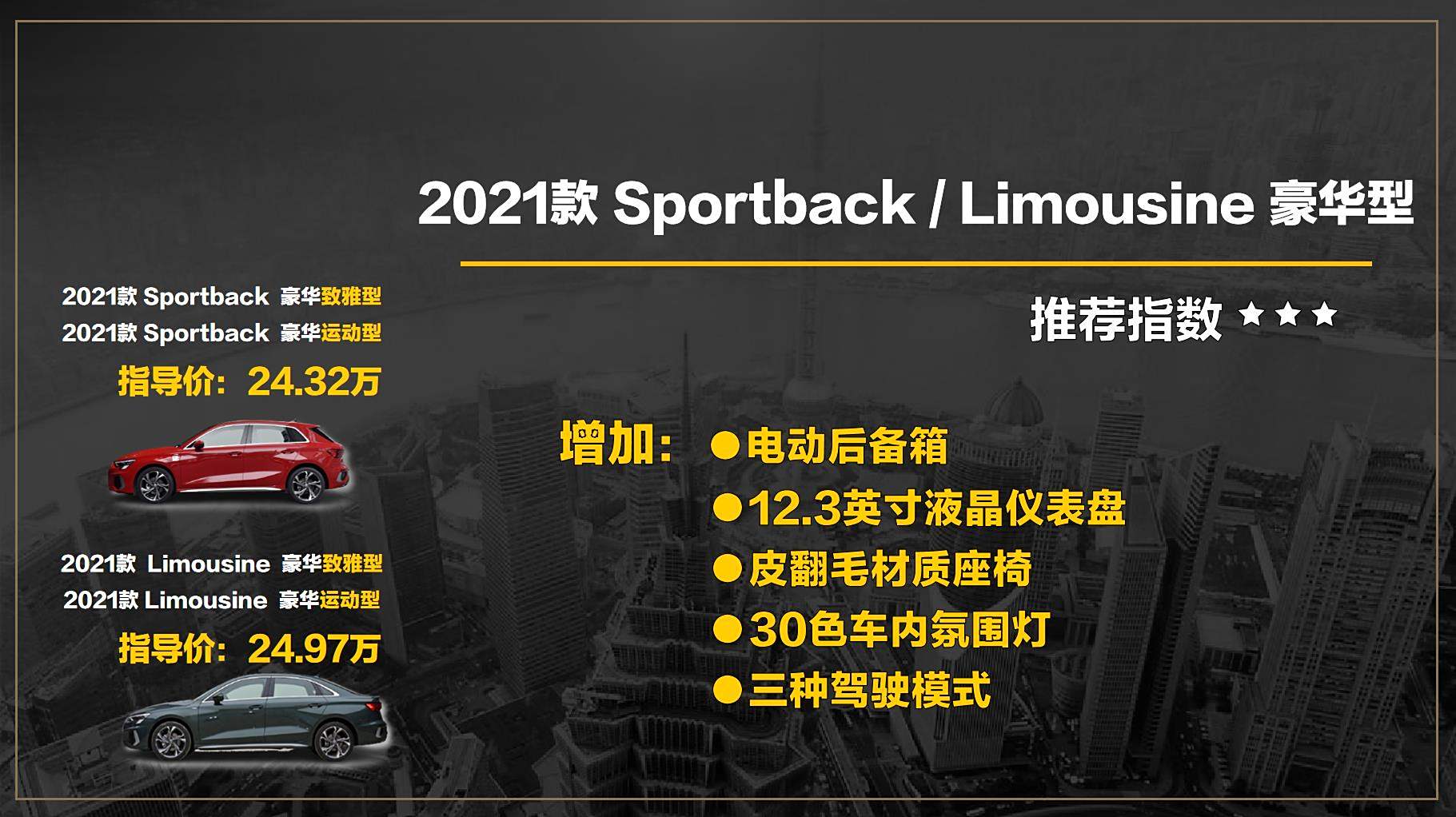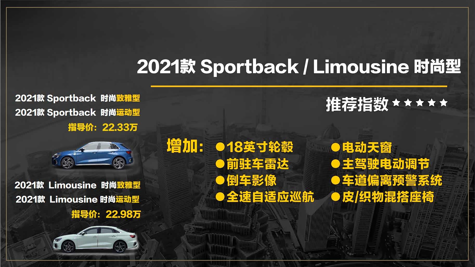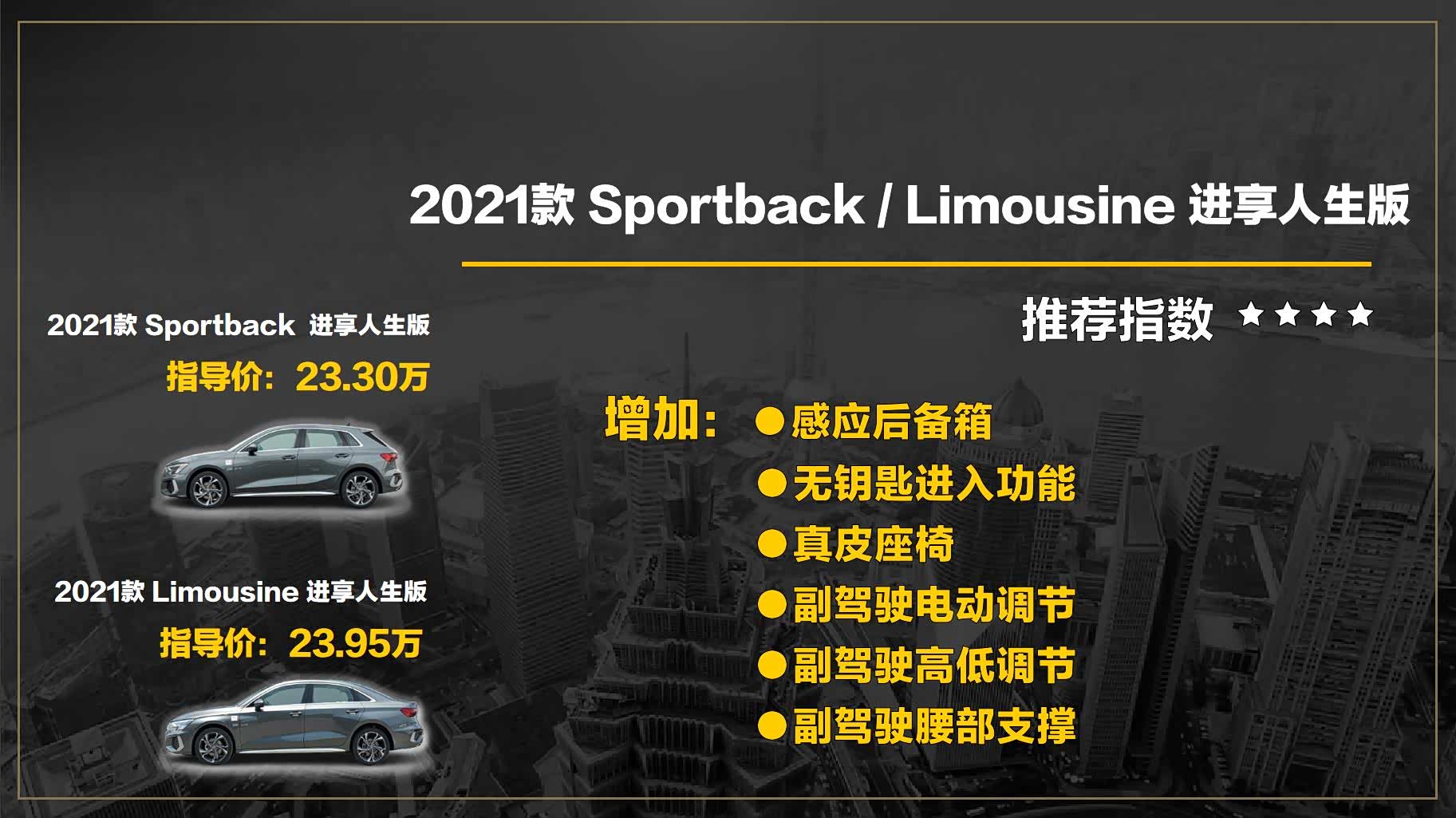 尽享人生型是2021款奥迪A3最新推出的版本,两厢三厢各一款,指导价分别为23.3万和23.95万,它在时尚型的基础上,升级了无钥匙进入和真皮座椅,同时,副驾驶座椅也提供电动调节和腰部支撑的调节;值得一提的是,三厢版本的尽享人生型,也提供了感应后备厢的功能,这贵出的0.97万,换这些配置,性价比也是不错的;