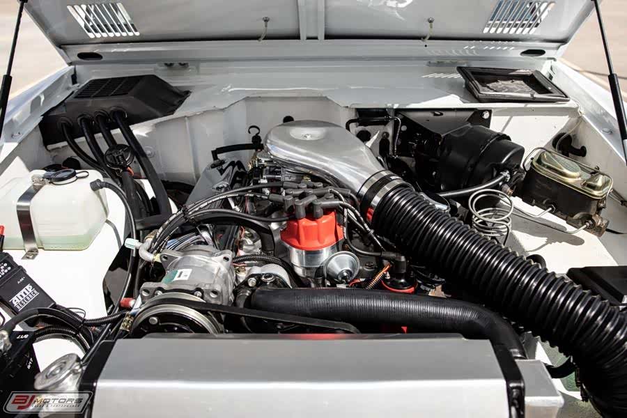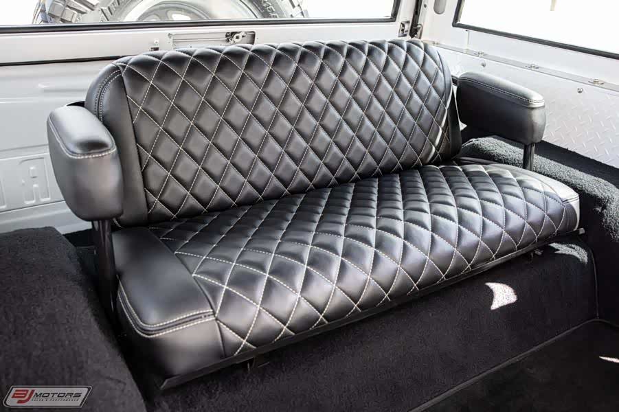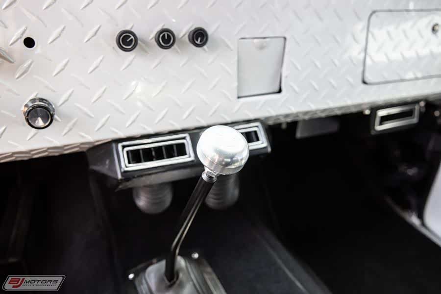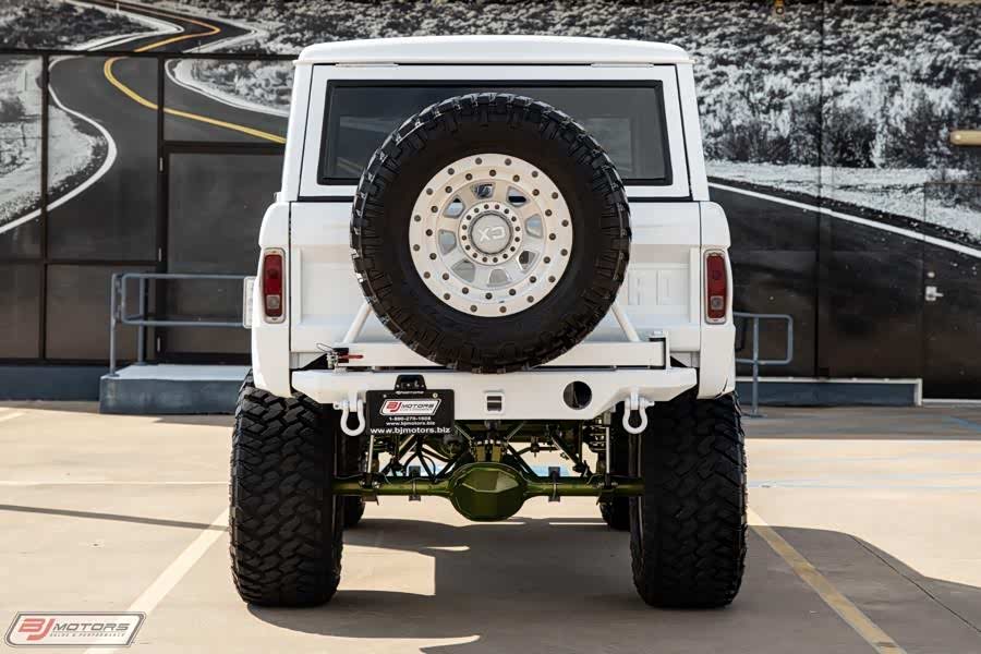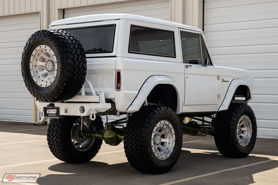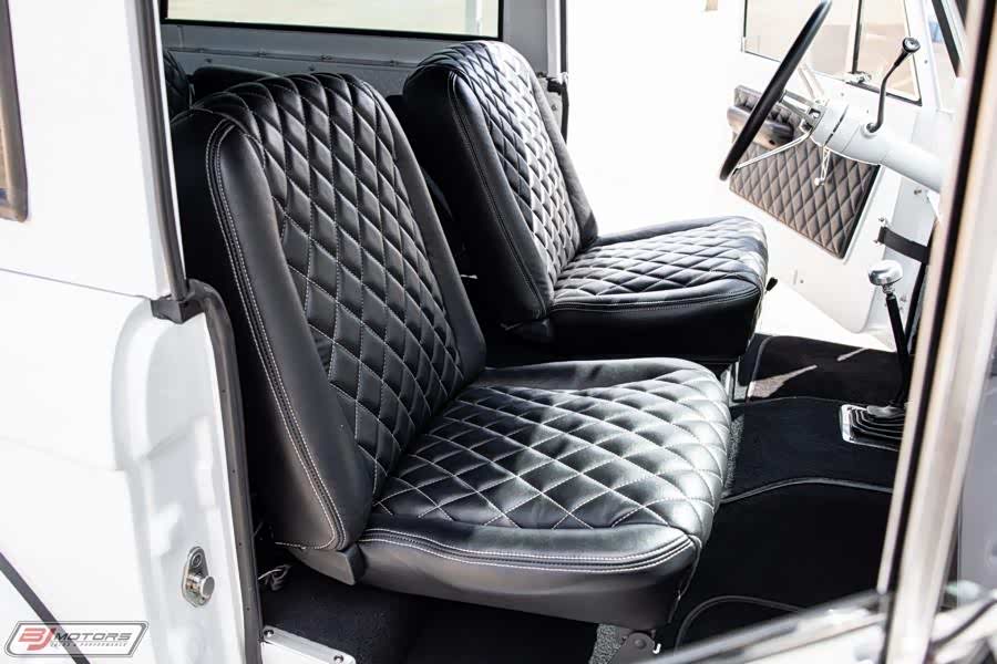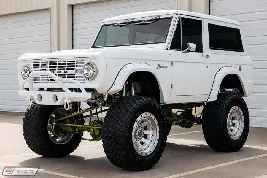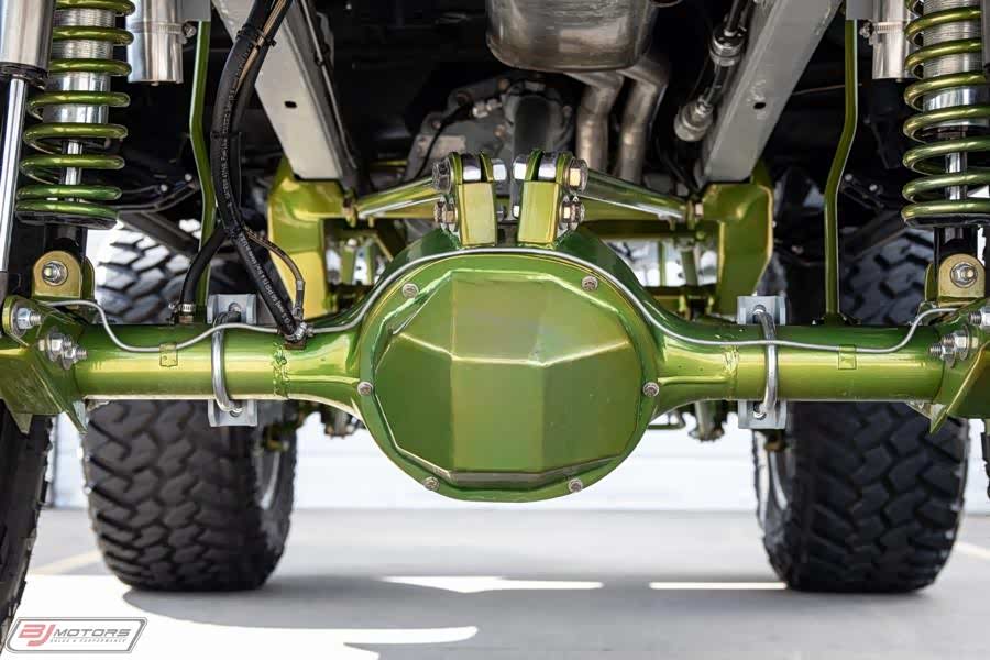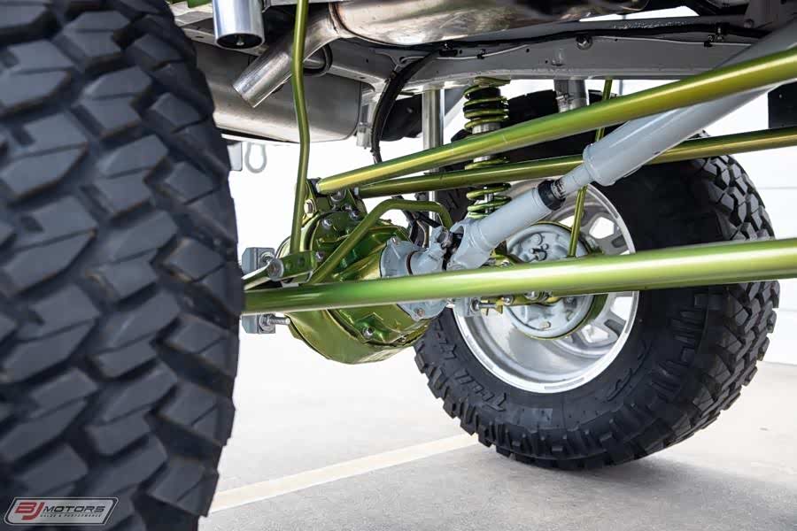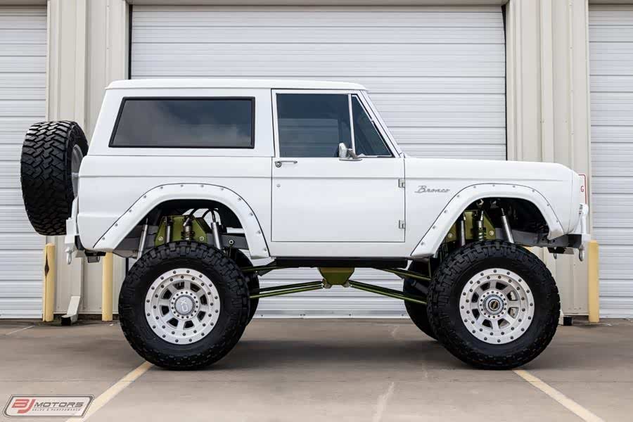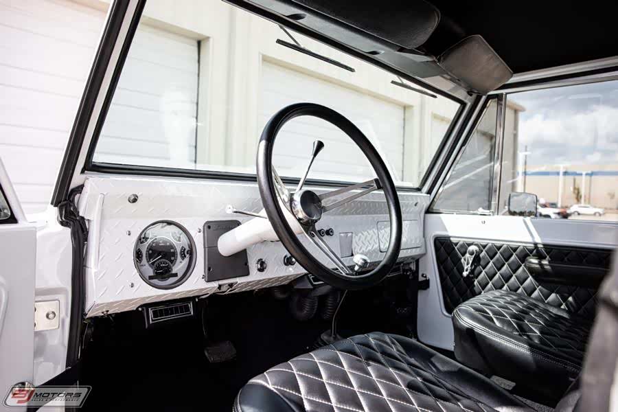 这辆修复的1973年的福特 Bronco让人眼前一亮。车辆外观采用全白色涂装,定制4连杆悬架、弹簧等都使用了淡绿色涂装,整体风格经典、优雅。