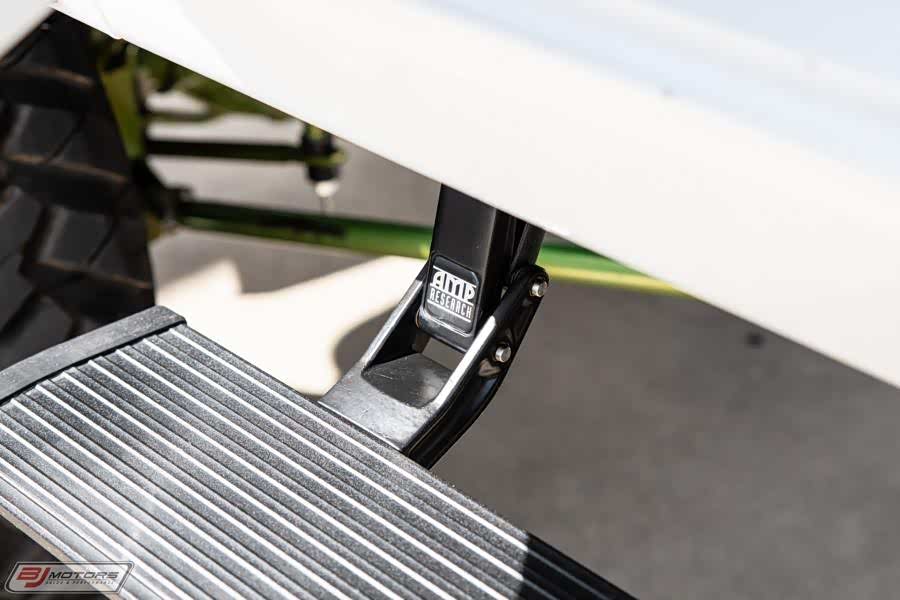 悬架举升之后带来了令人印象深刻的车身高度,配有巨大38 × 15.50 R20 Nitto Trail Grappler 轮胎,和多片式20 × 12 英寸 XD KMC 轮辋。轮拱使用了外露铆钉的宽体部件。