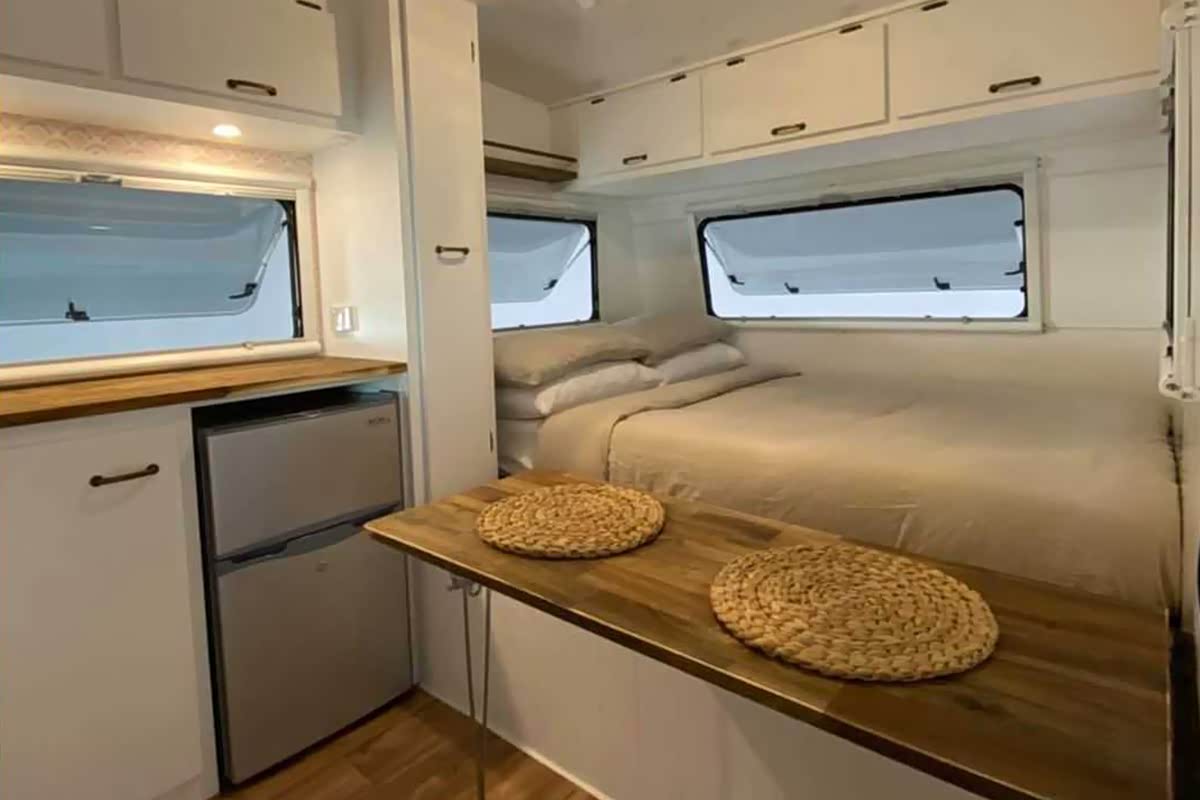 生活区中间位置是一张折叠餐桌,不用时可收纳到床铺一侧,后方的横置床铺可供两人休息,三扇车窗可为卧室进行通风采光。另外,上方配有顶柜,床侧还有放置长衣的衣柜。
