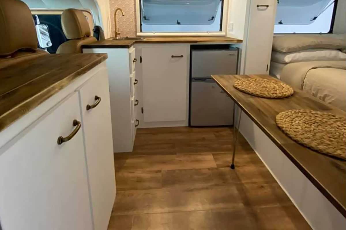 在生活区域内,大众T2露营车布局并不紧凑,前舱为分体式厨房、后舱为餐桌和横置床。在设计之初,官方就将其定义为一台适合两人旅居的房车,而类似布局对于两人来说也足够使用。厨房区域,大众T2露营车提供洗手池、炉灶、电冰箱,上下均配有橱柜,靠近车门的置物台也能方便用户进行切菜工序。