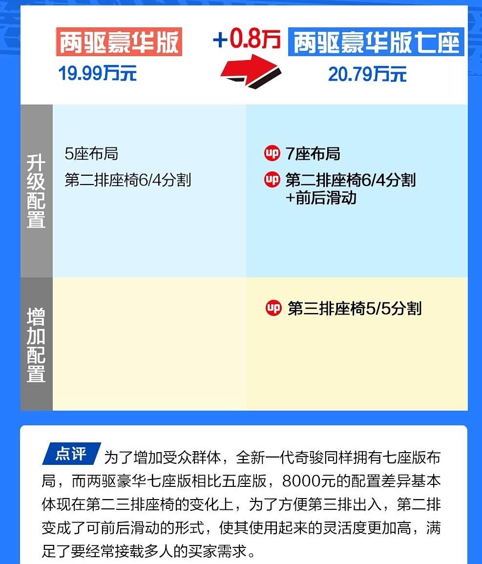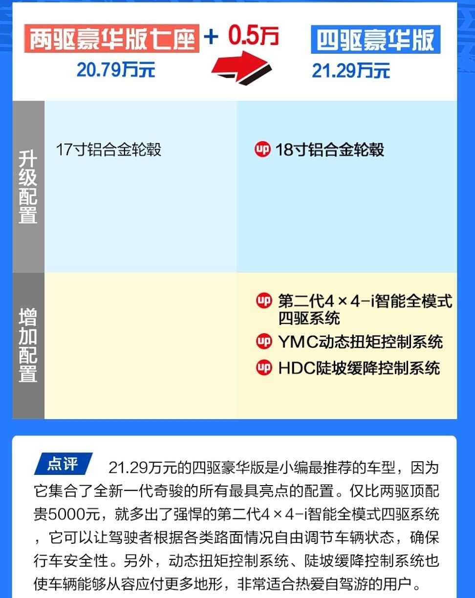 奇骏迎来了革命性的换代。7月30日,全新一代奇骏正式上市,共8款配置车型,售价为18.19-26.29万元。作为换代车型,新车是CMF-CD平台开发的首款SUV,注入了家族式V-Motion3.0设计语言,并拥有Nissan Connect超智联2.0车机、第二代4×4-i智能全模式四驱系统、VC-Turbo超变擎发动机等多项技术升级,那么这五款车型中哪一款更值得入手呢?就让小编为您一一剖析。